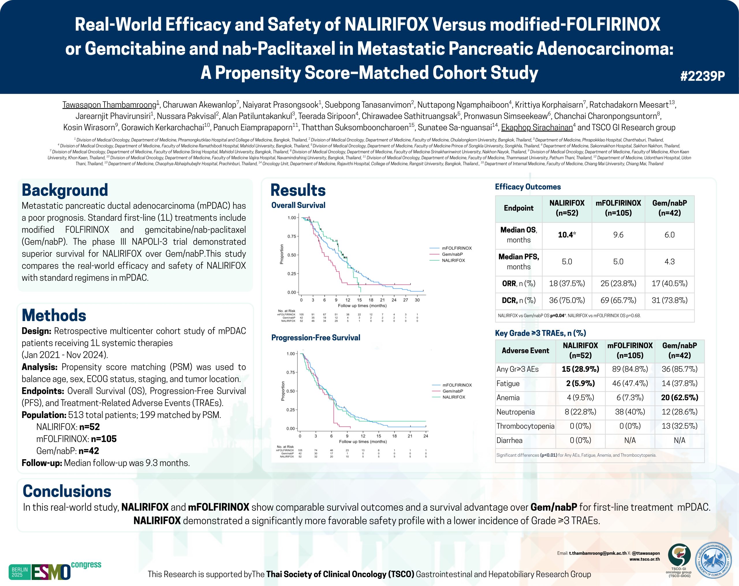 มะเร็งตับอ่อนระยะแพร่กระจายเป็นโรคที่มีพยากรณ์โรคไม่ดี. การศึกษานี้จึงมีความสำคัญอย่างยิ่ง โดยเป็นการรวบรวมข้อมูลผู้ป่วยในประเทศไทยเพื่อเปรียบเทียบผลการรักษาและความปลอดภัยของยาสูตรใหม่ NALIRIFOX กับยาสูตรมาตรฐานที่ใช้อยู่ในปัจจุบัน